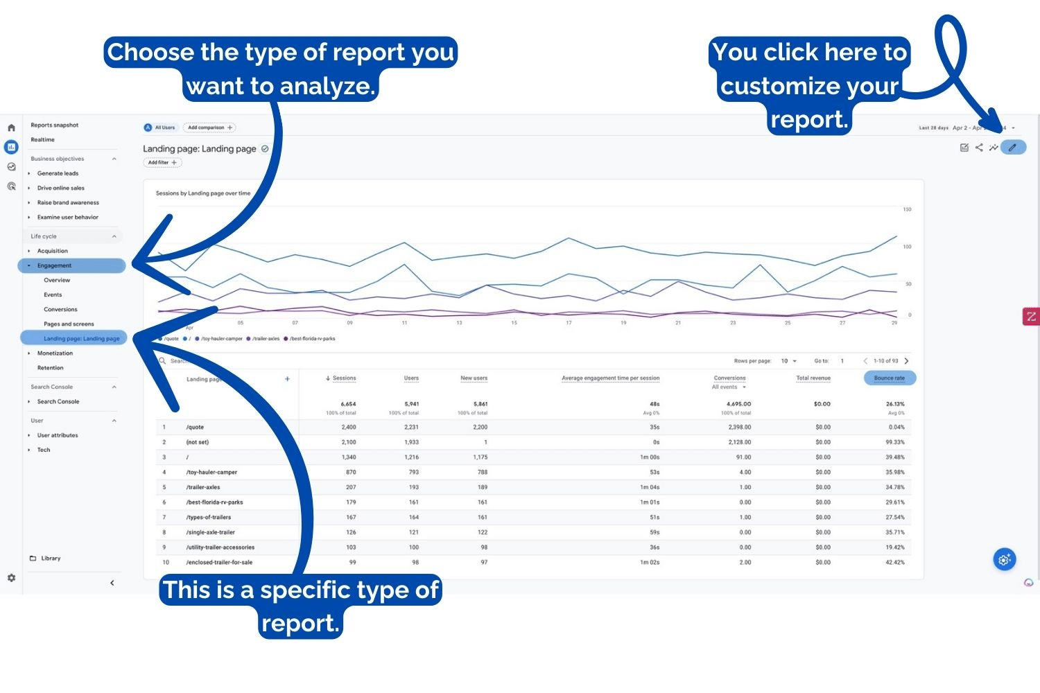 - Open A Detail Report: We recommend the Engagement > Landing Page Report for this.