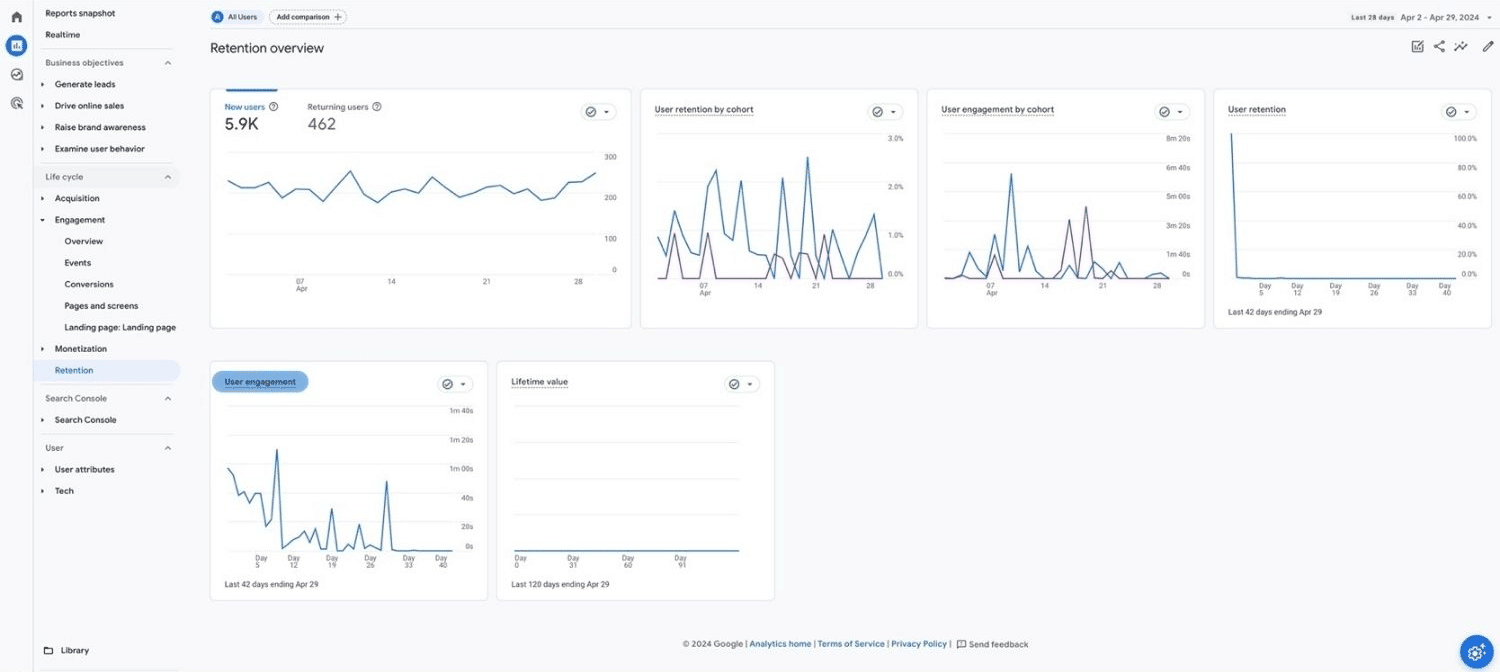 - User Retention: Measures how effectively your site retains users over time. High retention rates can indicate successful engagement strategies and a loyal audience.