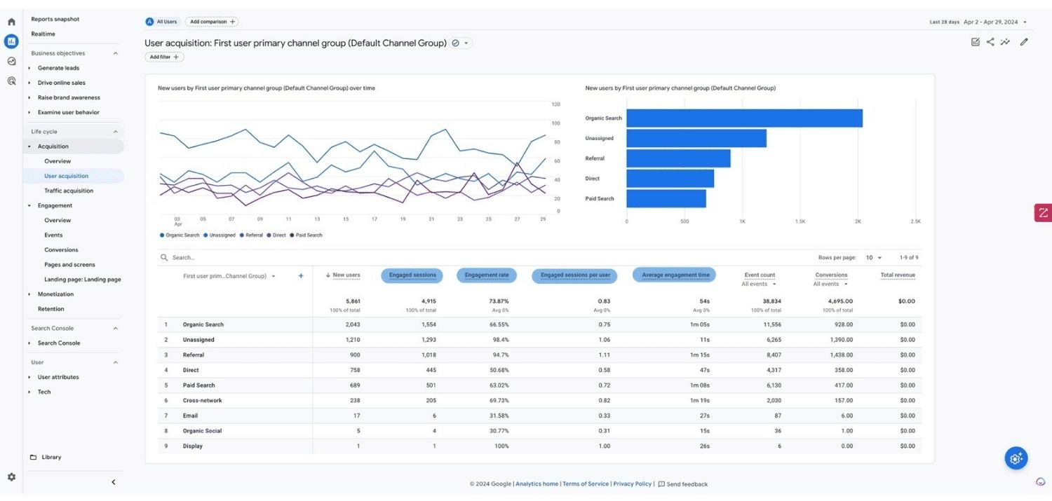 - User Acquisition: Identifies how users are finding your site, whether through organic search, paid ads, social media, or other sources. This information is crucial for optimizing marketing strategies and budgets.