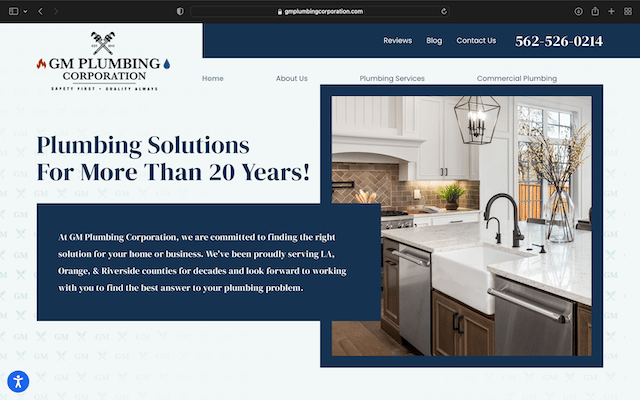 GM Plumbing Corporation's website is attractive, user-friendly, and mobile responsive. It includes a phone number in the header, ensuring visitors can contact them immediately. When opened, visitors are immediately greeted with a bold header letting them know that this business has been Plumbing for more than 20 years!