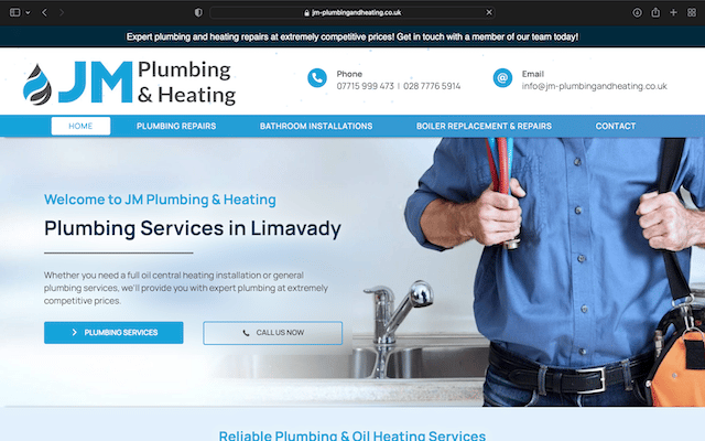 This website prominently displays the contact number and email address to increase conversion. The logo on the website makes a terrific first impression; JM Plumbing UK has a magnificent logo that is ready to provide the company identification and brand awareness.