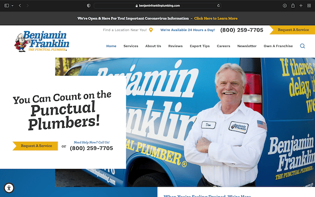 Benjamin Franklin Plumbing uses the tagline “the punctual plumber” as a terrific marketing strategy that can help the company stand out from its competitors. Also, it includes the number to call for emergency repair and service.