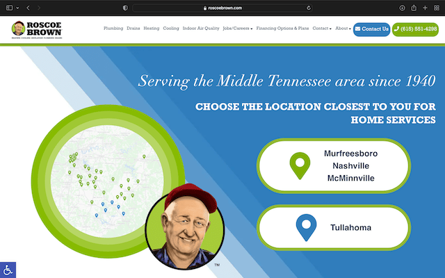 The homepage of RoscoeBrown's plumbing website has a simple but stylish design. A good plumbing website should have simple CTAs, prominent phone numbers, a beautiful logo, and a clear display of services. Roscoe brown has all of these.