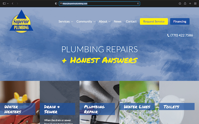 On the header of this plumbing website, there are phone numbers and two call-to-actions. A visitor, for example, can simply request assistance online, while another can request financing. The services are represented by large, beautiful, flat, and clean icons. Visitors are also impressed with Superior Plumbing's testimonies in one section. Community events, brands that trust Superior Plumbing, and club and community initiatives are all important components of the website.