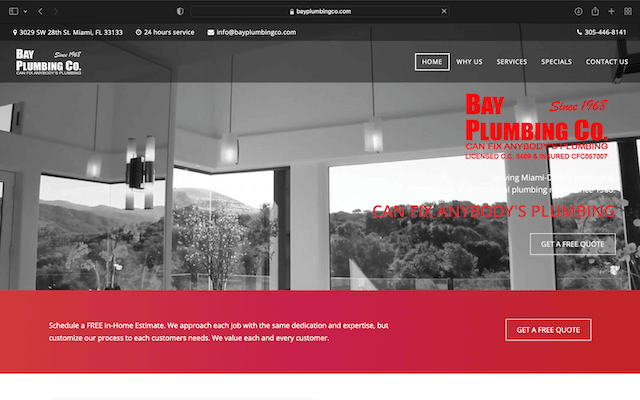 Bay Plumbing Co also has a wonderful red and white color scheme with minor animation that makes it look classy. The site contains a sticky bar menu for simple navigation, unique discounts, and coupons for various plumbing services.