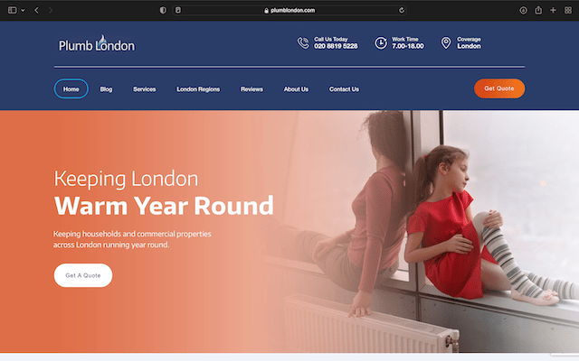 The phone number and work time for Plumb London are vividly displayed on the website's header, ready to provide rapid plumbing services. Brands that trust them, booking request forms, corporate services, testimonials, and more are all important website elements. What's more, this site has a blog! This is something we haven't seen in other sites so far.