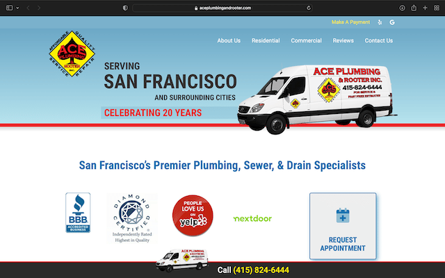 This commercial plumbing company's website features honors and certificates, contact information, and a CTA area for scheduling appointments. Aside from that, the business has separate pages for residential and commercial clients. There is also a video that customers can watch to understand more.