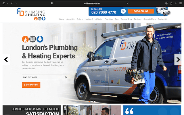 FD Plumbing uses carousels to present imagery. It has phone numbers and a call to action in the header, making it easy for visitors to contact them. This site also employs a separate page to present google reviews, bookings, and guarantees. Their businesses, including fixing drains, water damage, installation, and other plumbing repairs, are represented on the site by large, vivid, and strong symbols. It also uses a carousel to demonstrate different clients that trust their plumbing services.