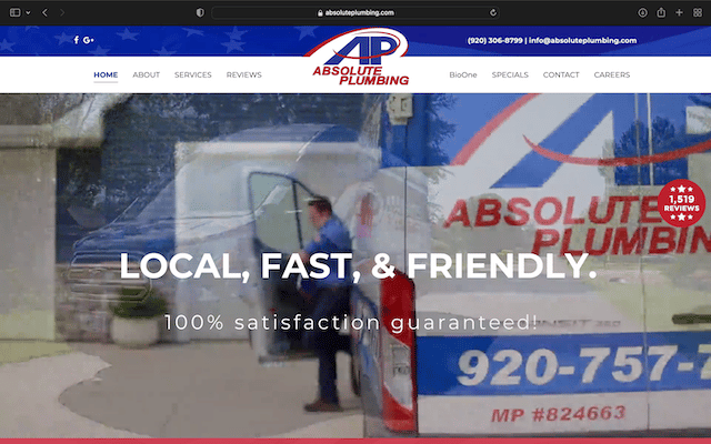 Absolute Plumbing's website is designed in a modern, professional manner. It also features the iconic red, blue and white color scheme. Aside from that, visitors are greeted with a video playing in the background. There's also a lot of whitespaces to catch and hold the customer's attention.