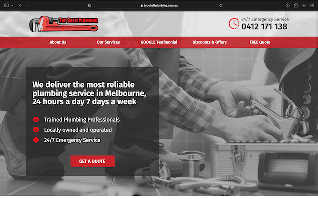 Top Shelf Plumbing's website is sleek and modern and clean, and simple to use. With little to no effort, you can find the page you're looking for. When you open the site, the first thing you see is a photo of its owner with a form you can easily fill out to contact him. They also linked their social media accounts to their website to make interaction and communication easier.