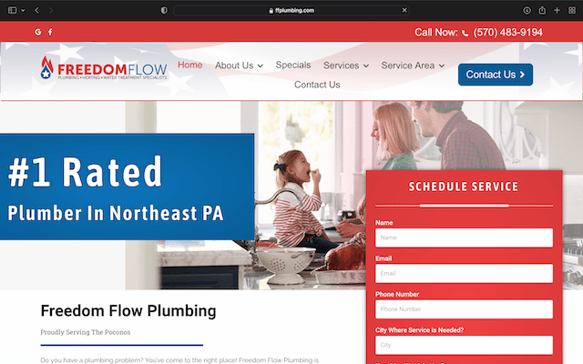 The background photo for the plumbing website stands out from the pack with poetic and patriotic emotions. Customers can easily navigate the Freedom Flow homepage, as it has subsets of services ranging from HVAC to kitchen remodeling.