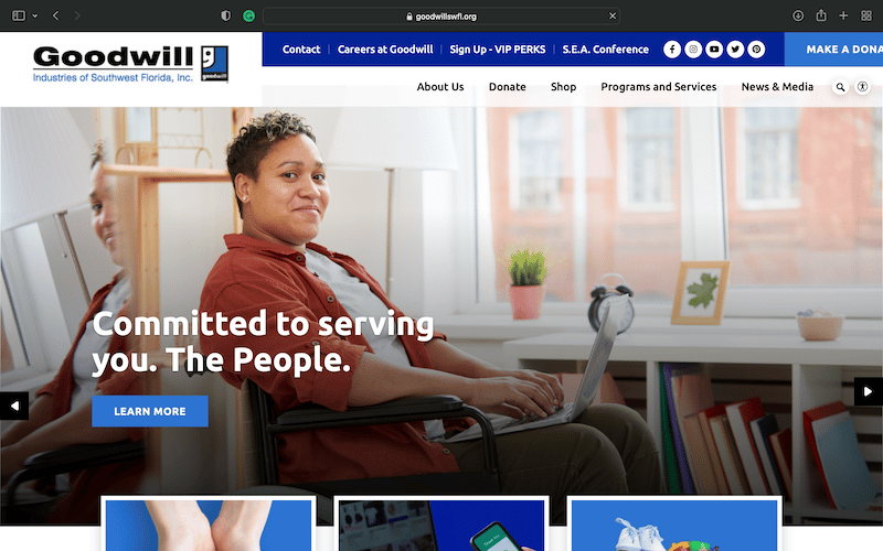 Goodwill Industries of Southwest Florida strives to help those with disabilities or who face other disadvantages by providing free employment and career services. The website is designed to be appealing to both groups the organization serves: its constituents and donors.